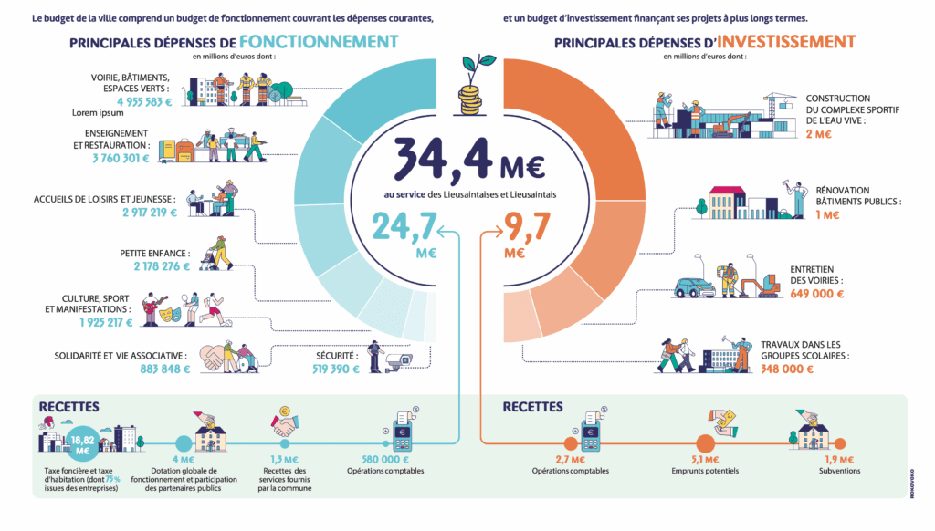 Le budget de la ville comprend un budget de fonctionnement couvrant les dépenses courantes, et un budget d’investissement finançant ses projets à plus longs termes.