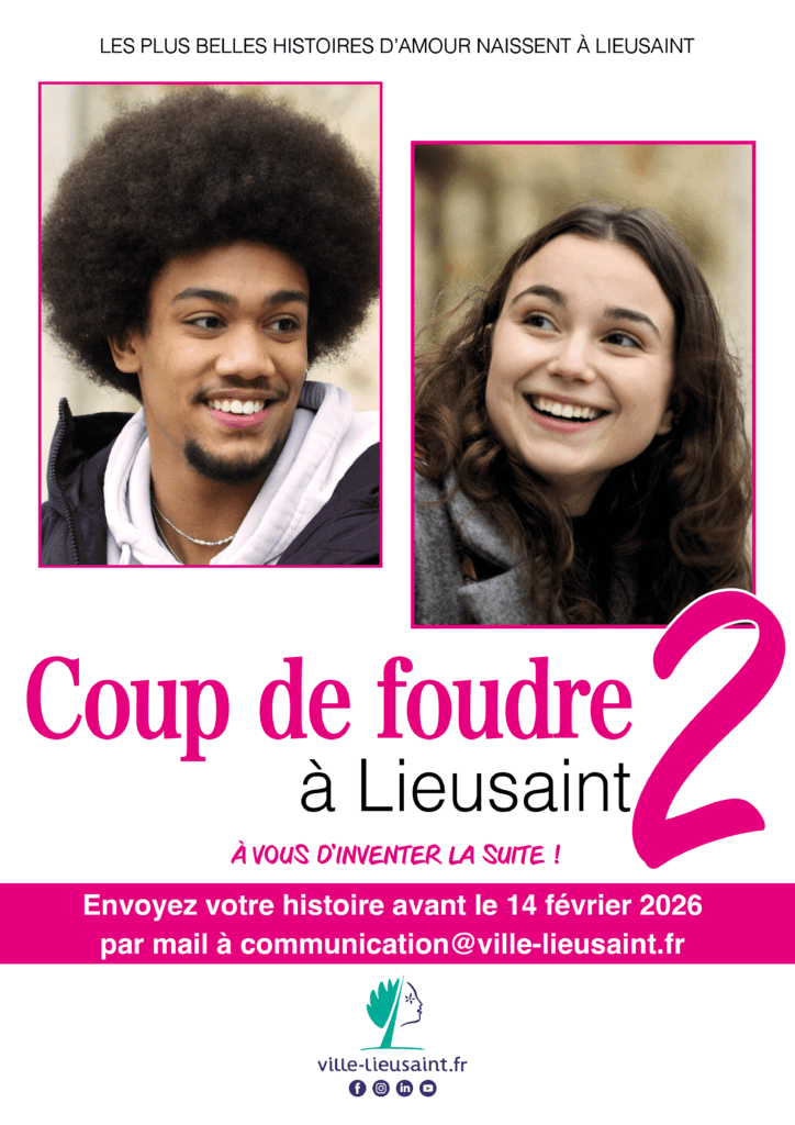 Imaginez votre Coup de foudre à Lieusaint 2, avec de nouvelles aventures pour Enya et Samuel, ou la découverte d’une nouvelle histoire d’amour. Qu’elle soit drôle, touchante ou poétique, écrivez votre histoire et envoyez-la avant le 14 février 2026, par mail à communication@ville-lieusaint.fr ou par message privé sur nos réseaux sociaux. Celle-ci ne doit pas dépasser 2 pages au maximum, et doit inclure les personnages de l’histoire ou un coup de foudre ayant lieu sur la commune de Lieusaint.