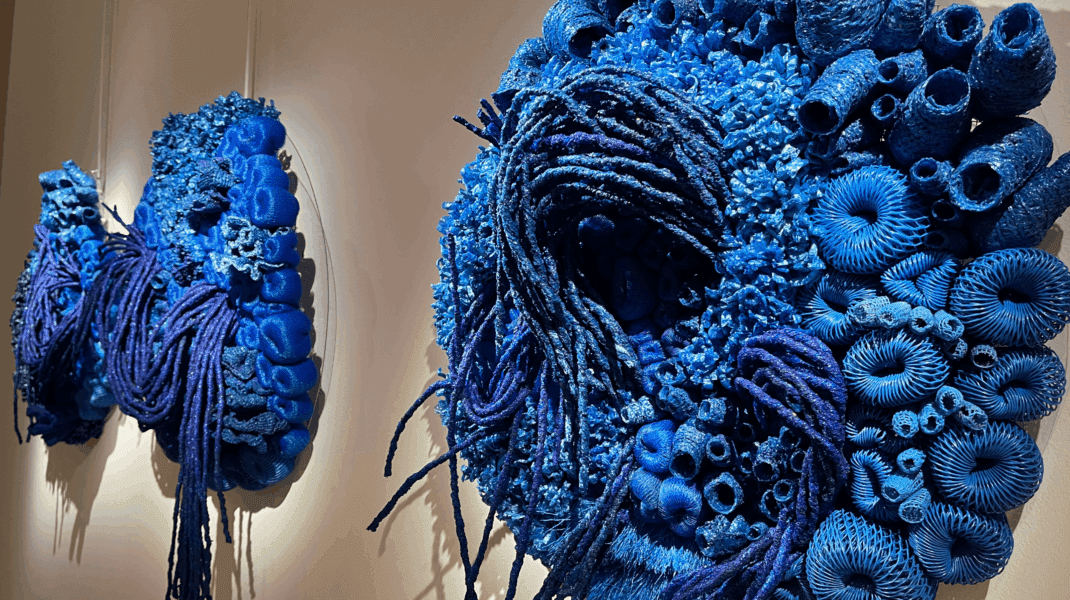 À partir de matériaux récupérés -filets alimentaires, bouchons en plastique, tubes de feutres- elle recompose une faune et une flore sous-marine aussi riche qu’imaginaire. Son travail donne à voir un monde fragile, où le recyclage est au service de l’art et l’art au service du recyclage.