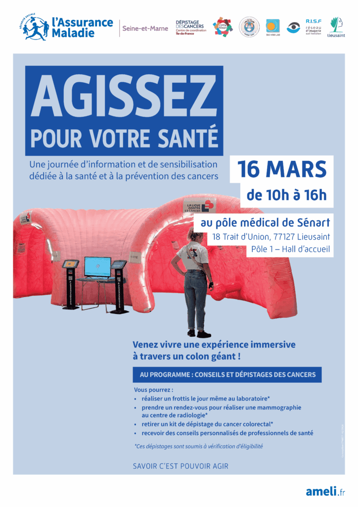 Lundi 16 mars de 10h à 16h au Pôle médical de Sénart (pôle 1 - Hall d'accueil - 18 Trait d'Union, 77127 Lieusaint.